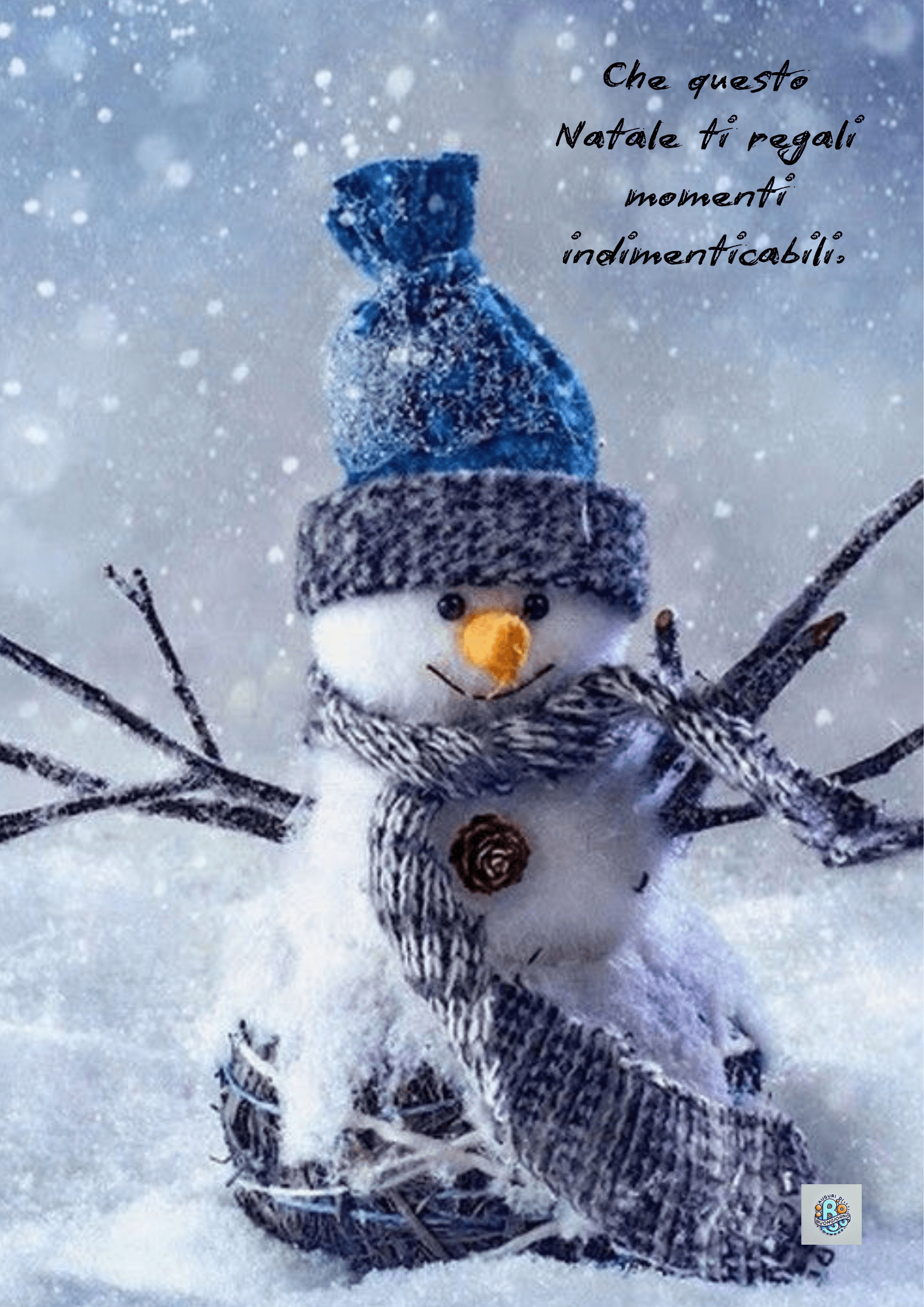 Un pupazzo di neve con un cappello blu e una sciarpa grigia, immerso nella neve. Un’immagine gioiosa che cattura lo spirito natalizio, perfetta per celebrare momenti indimenticabili.