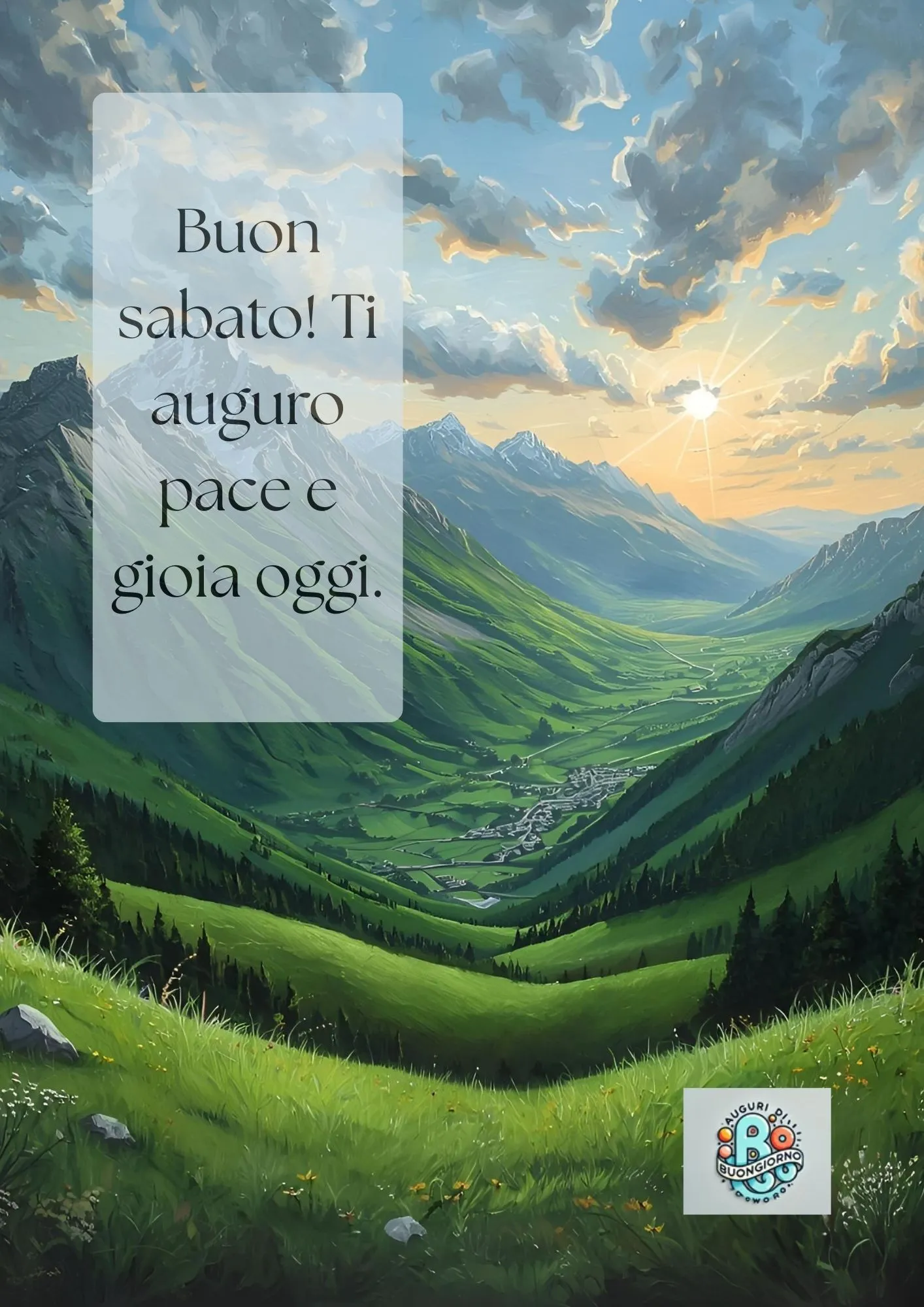 Valle verde luminosa con montagne e cielo nuvoloso, con il testo “Buon sabato! Ti auguro pace e gioia oggi.”