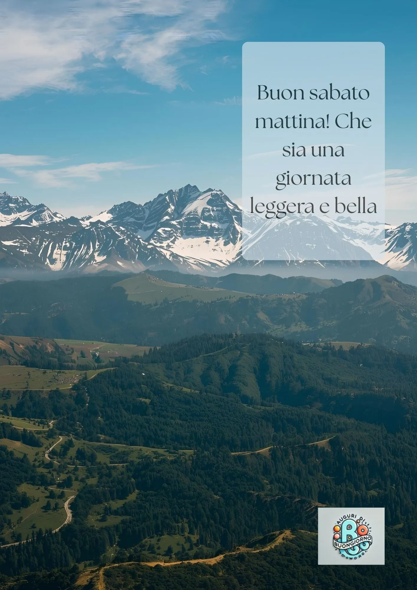 Veduta dall’alto di montagne e colline verdi sotto un cielo azzurro, con il testo “Buon sabato mattina! Che sia una giornata leggera e bella.”