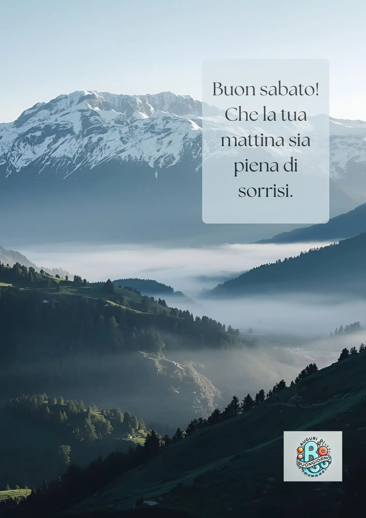 Panorama montuoso con nebbia mattutina e valli verdi, con il testo “Buon sabato! Che la tua mattina sia piena di sorrisi.”