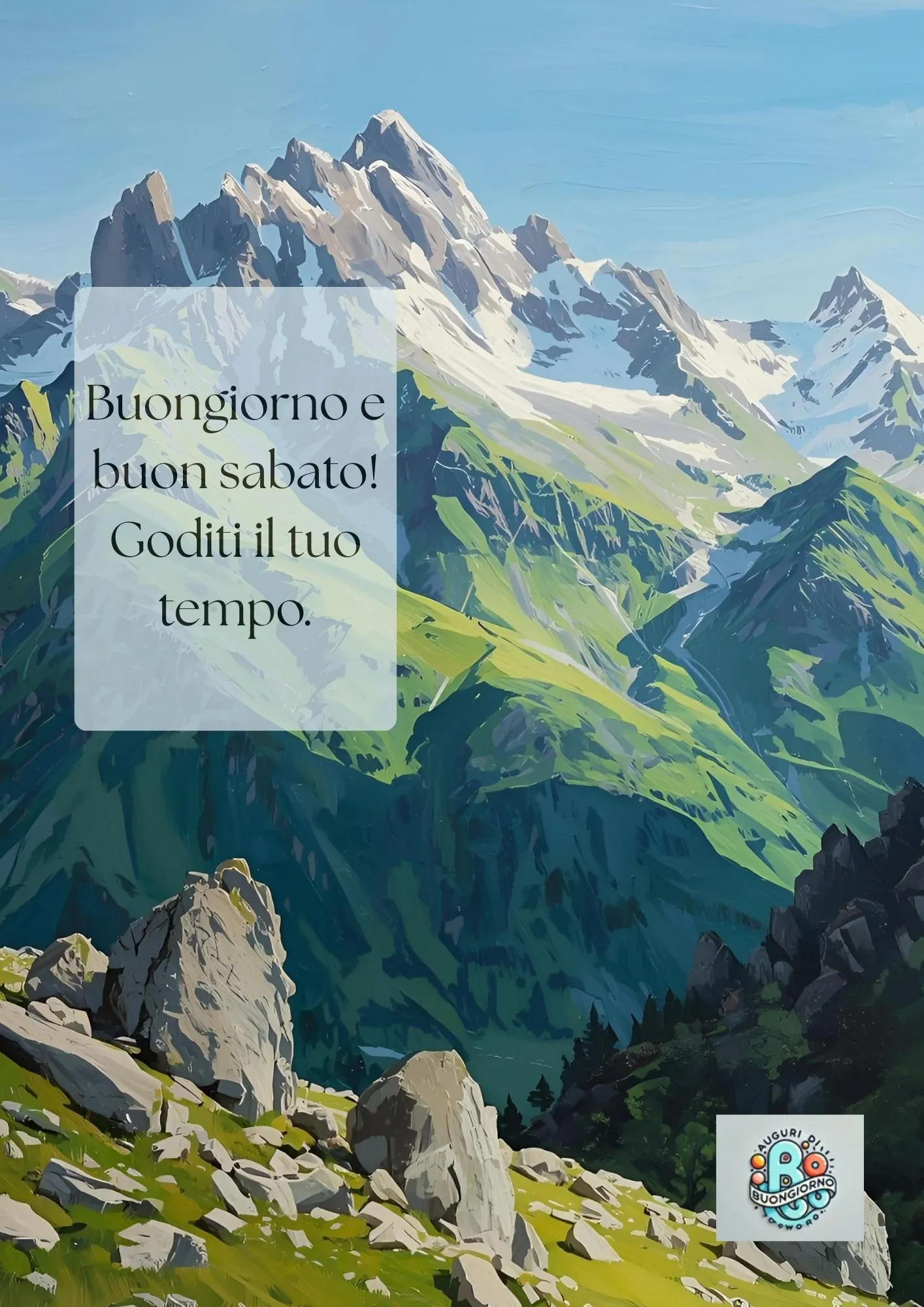 Montagne dipinte in stile artistico con prati verdi e rocce, con il testo “Buongiorno e buon sabato! Goditi il tuo tempo.”