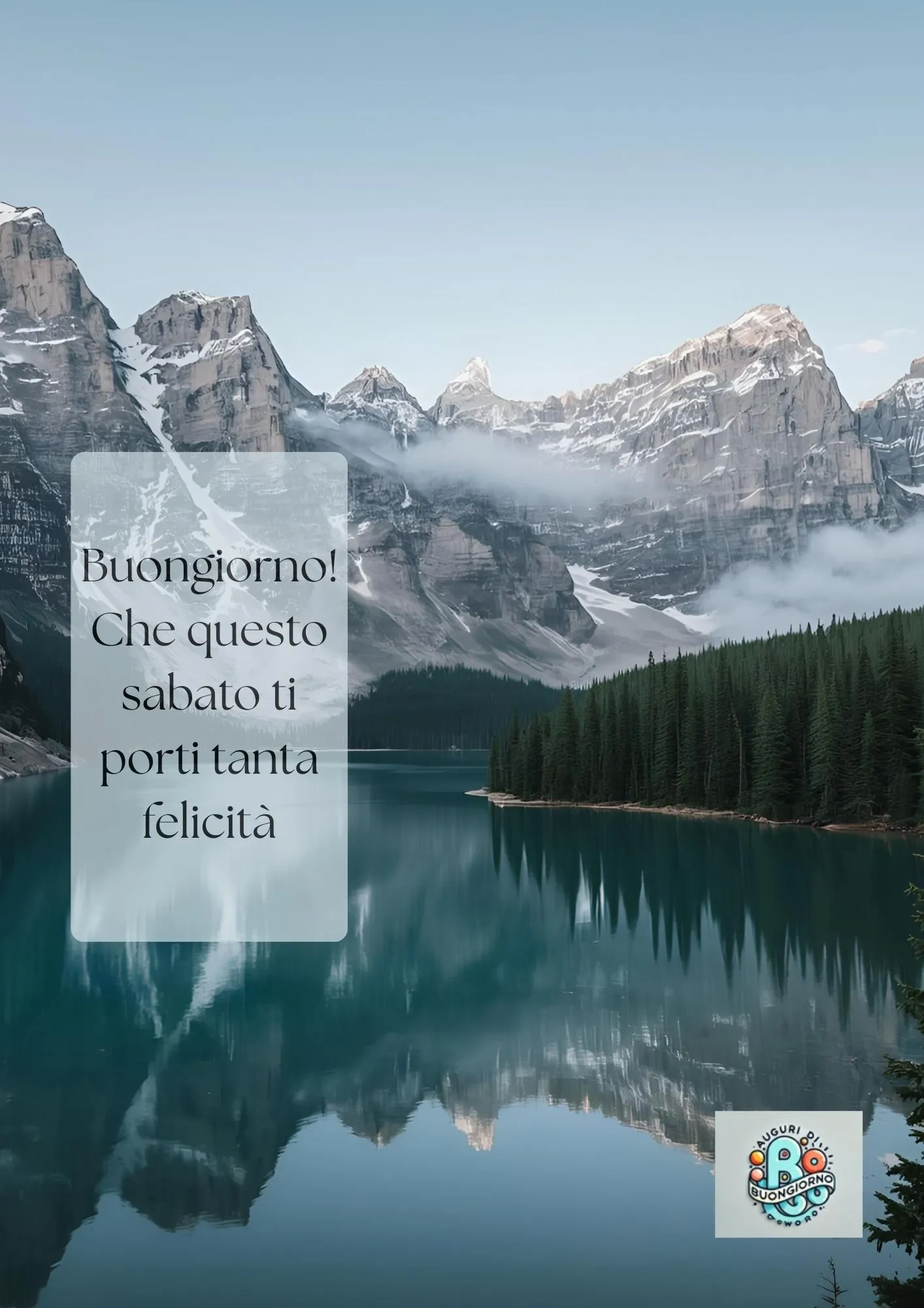 Lago alpino calmo con montagne innevate e foresta di pini, con il testo “Buongiorno! Che questo sabato ti porti tanta felicità.