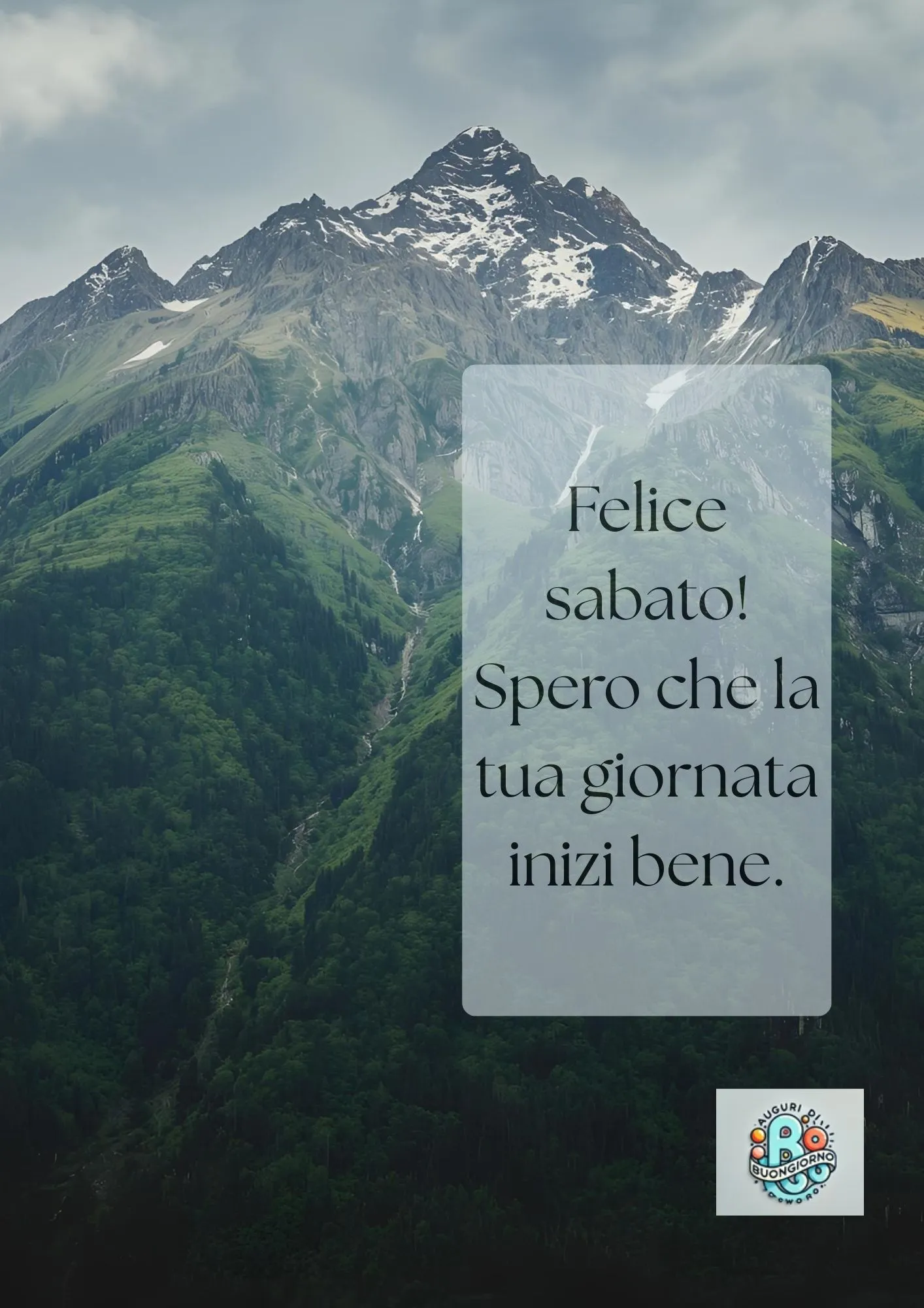 Paesaggio di montagne verdi con cime innevate e cielo nuvoloso, con il testo “Felice sabato! Spero che la tua giornata inizi bene.”