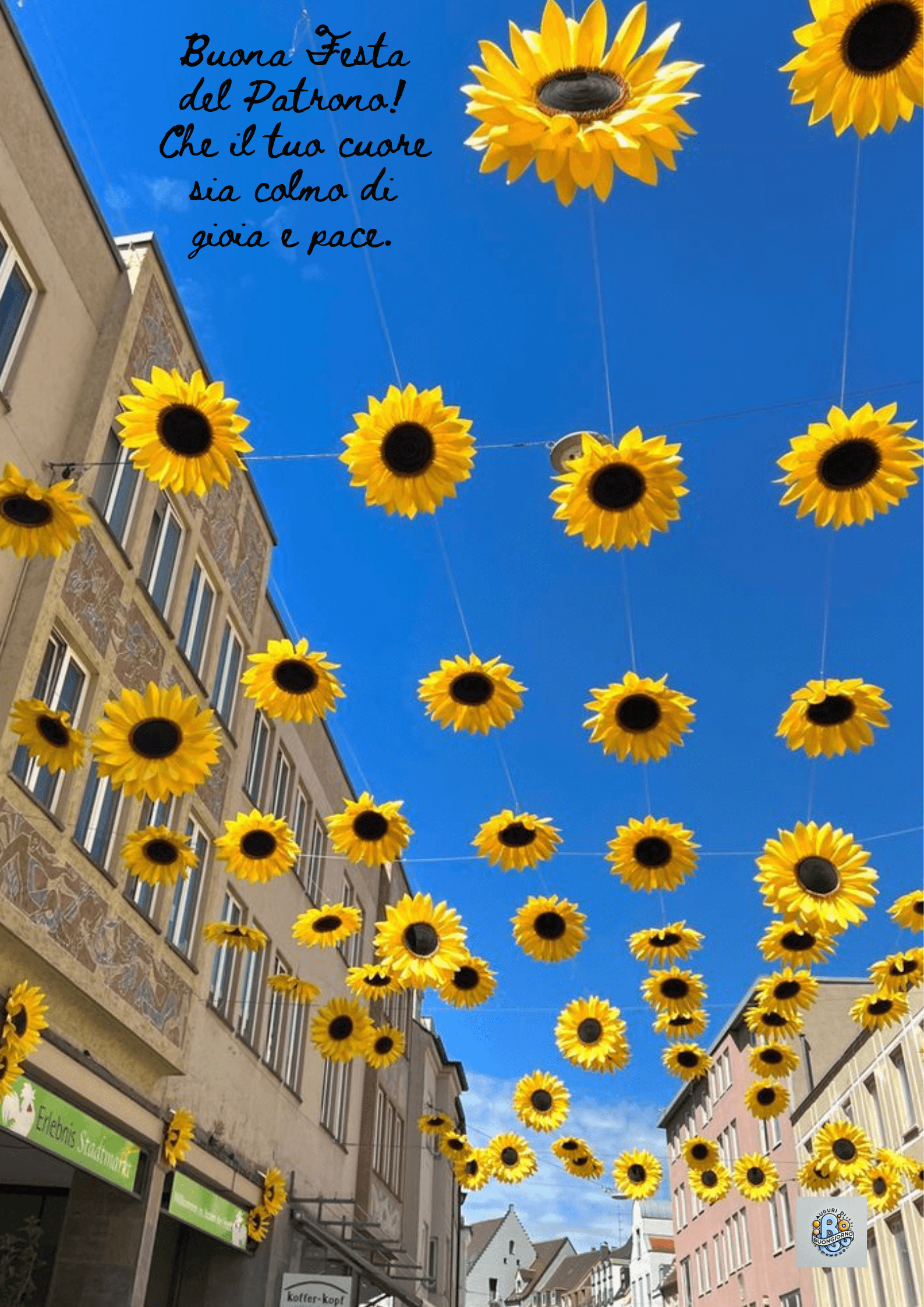 Un cielo azzurro illuminato da girasoli sospesi adorna le strade durante la Festa Patronale, creando un’atmosfera di gioia e pace. Una celebrazione che unisce la comunità, in occasione delle Feste e Ricorrenze locali.