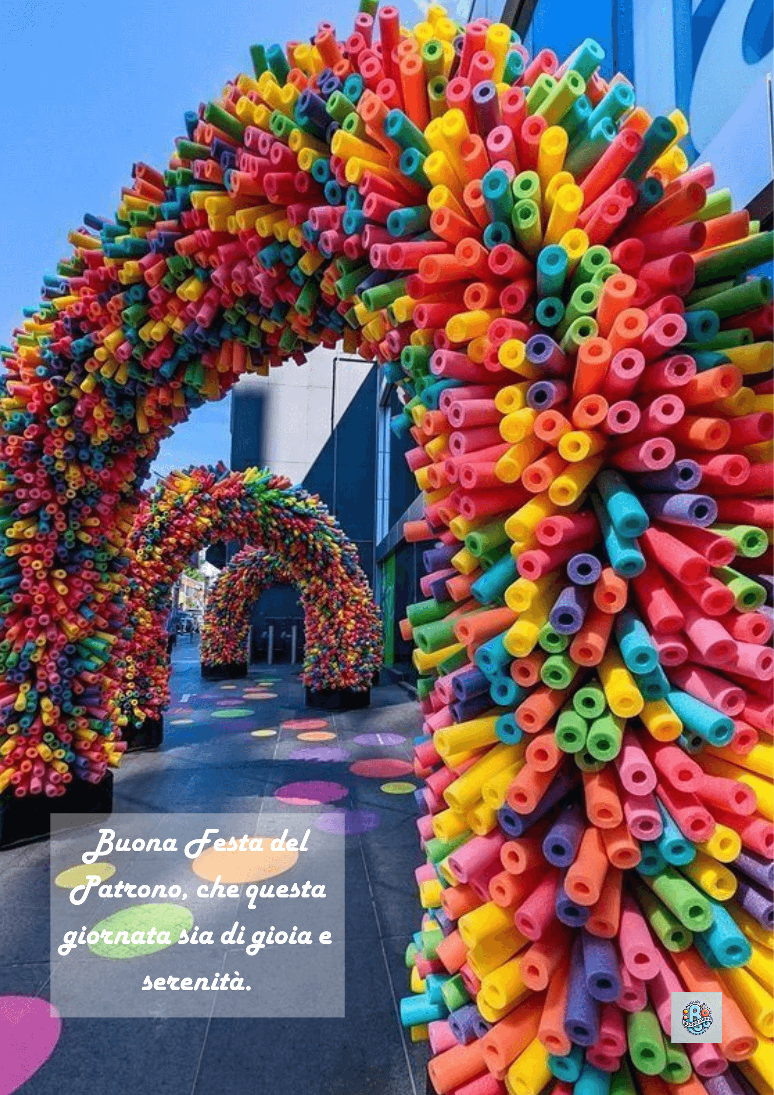 Due archi vibranti di colori vivaci accolgono i festeggiamenti, con tappi colorati che adornano la strada, simbolizzando gioia e serenità per la festa del patrono. Un’esplosione di energia e felicità.