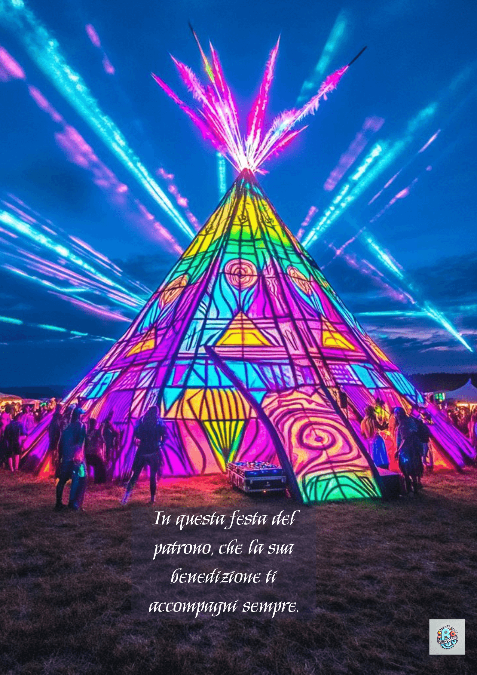 Una tenda vibrante illuminata da colori brillanti e fuochi d’artificio, creando un’atmosfera magica e festosa per la celebrazione del patrono. Un’esperienza di gioia e benedizione.