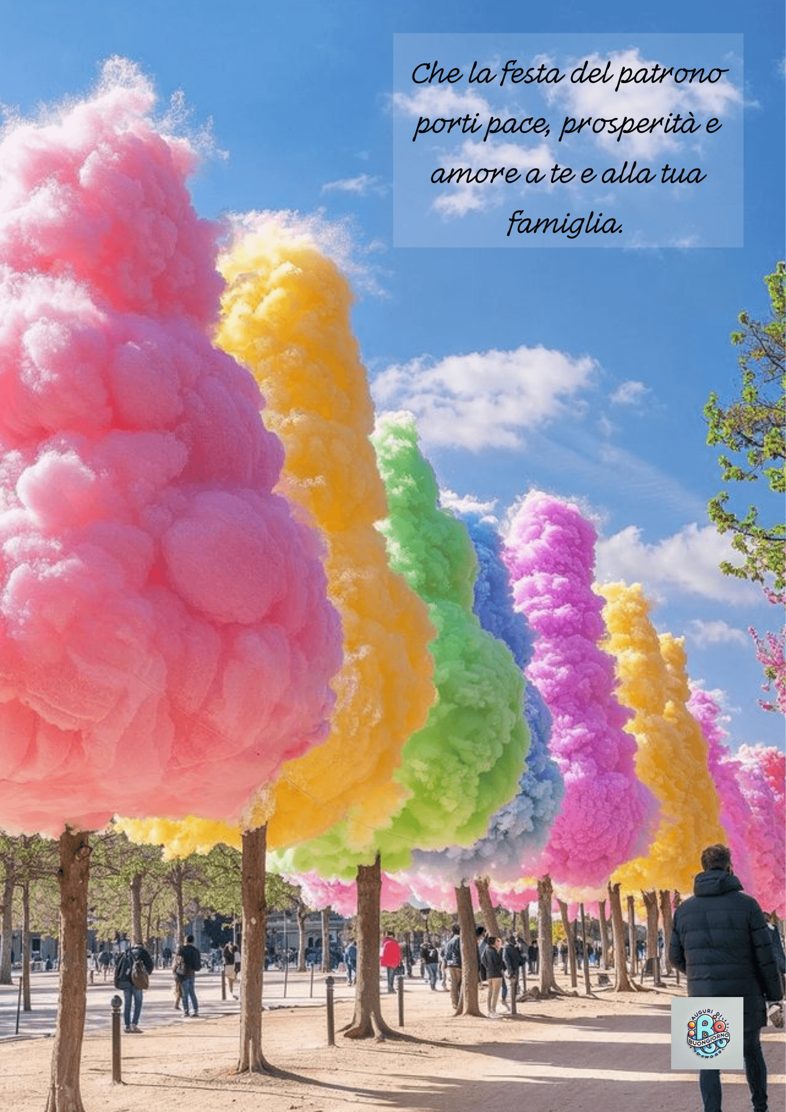 Un incantevole viale di alberi dalle sfumature di cotone zuccherato, portando serenità e allegria alla celebrazione del patrono. Un messaggio di pace e amore.