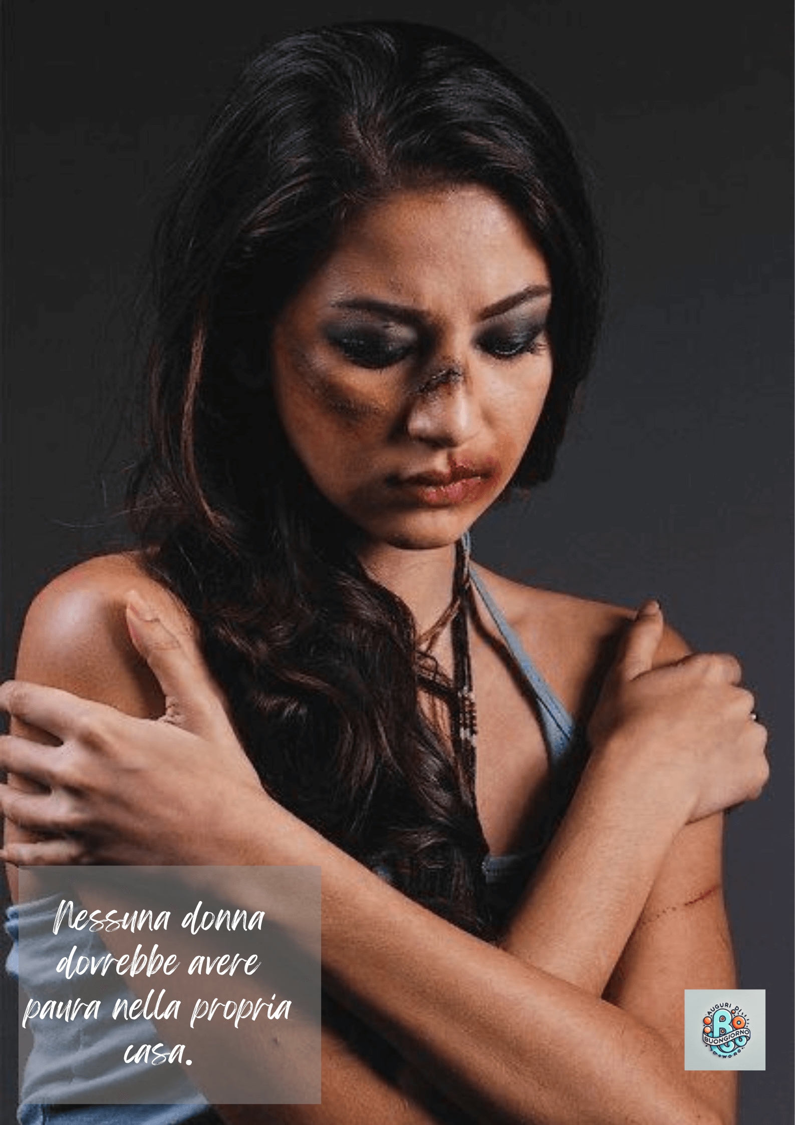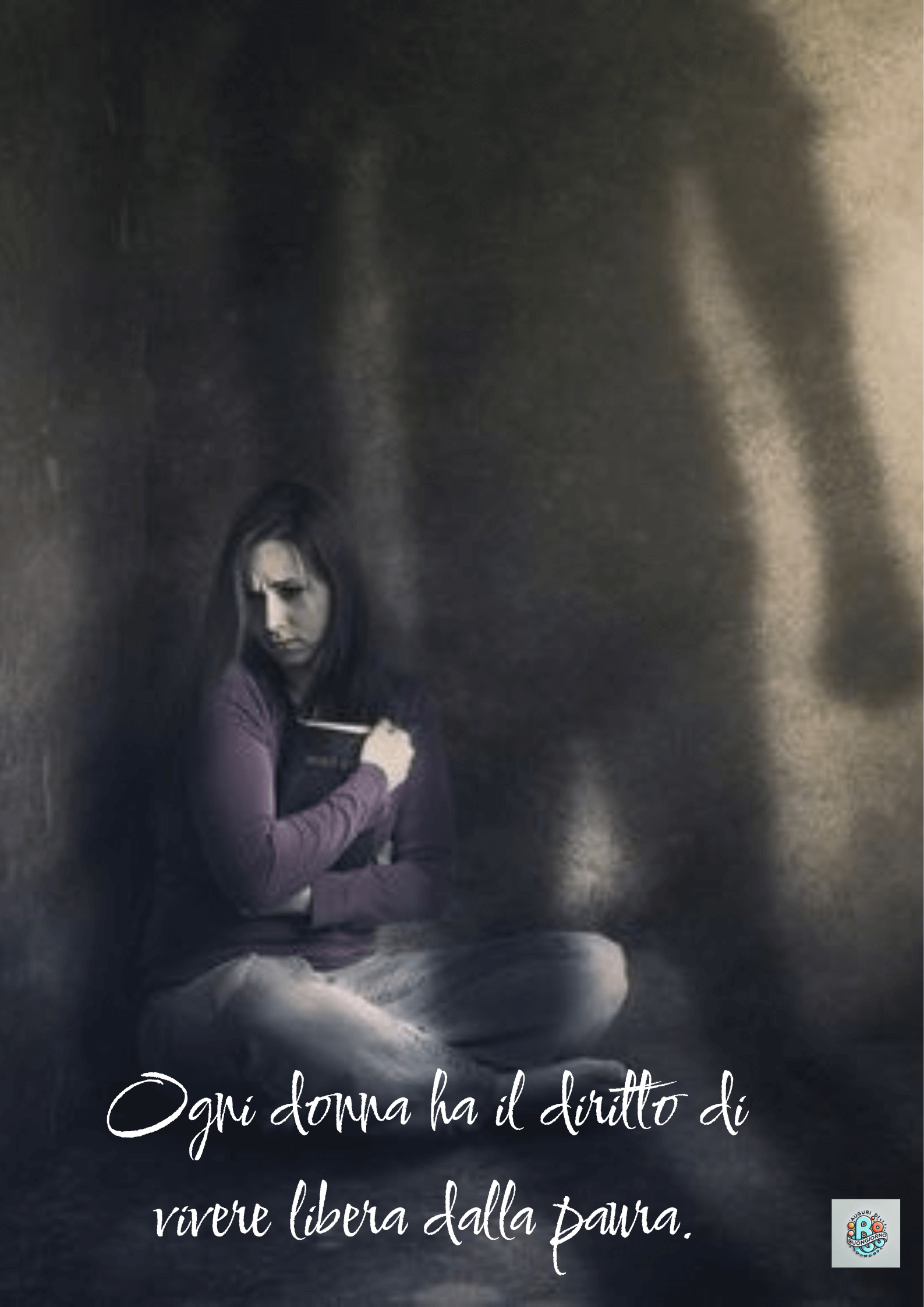 La donna rannicchiata nell’ombra simboleggia la paura vissuta da molte vittime di abusi. Ogni donna ha il diritto di vivere senza timore, in sicurezza. Consapevolezza contro la violenza e supporto sociale sono essenziali per garantire dignità e protezione.