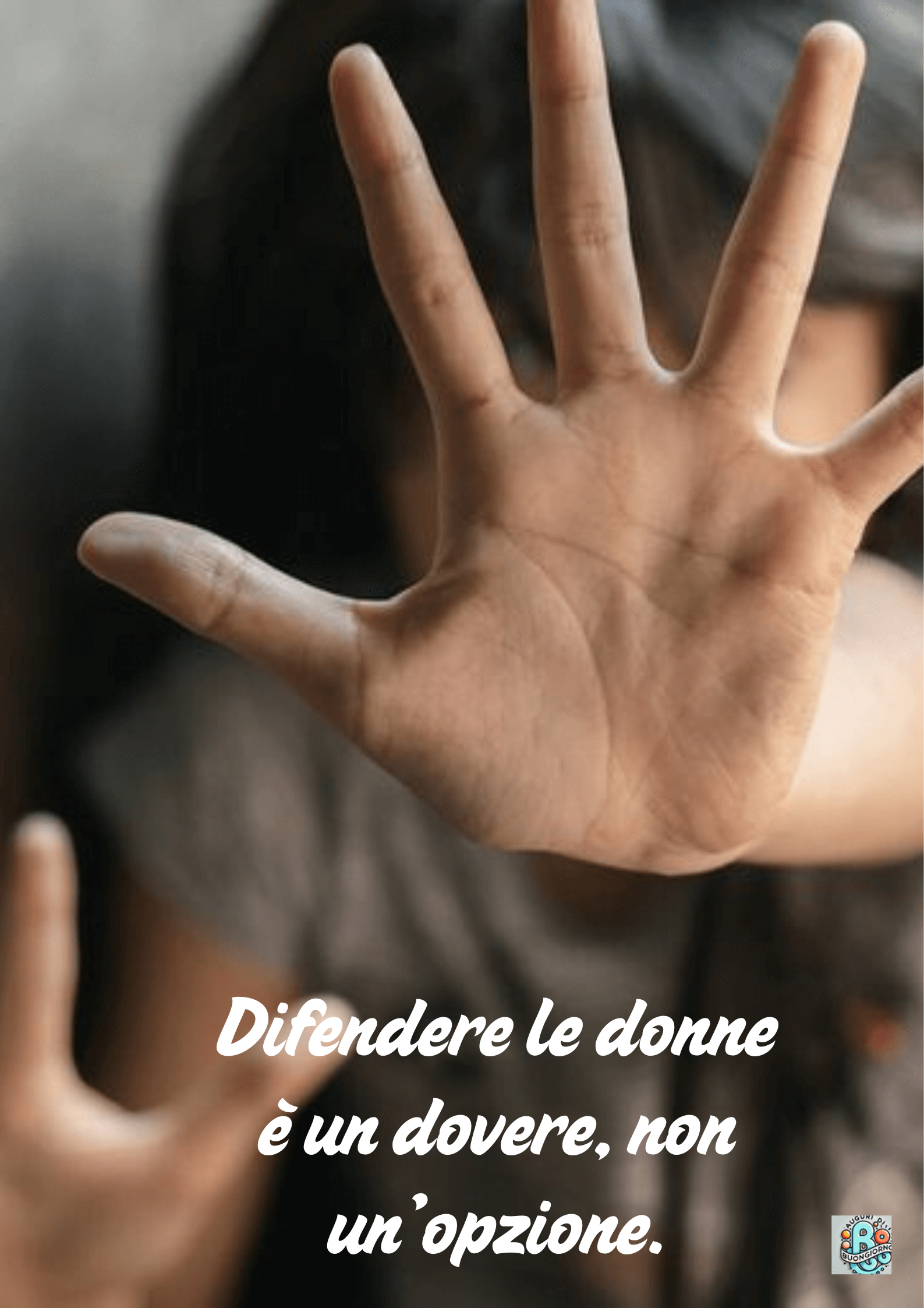 Un gesto forte e simbolico: una mano sollevata che dice basta alla violenza. In primo piano, la fermezza; sullo sfondo, la vulnerabilità. Difendere le donne non è una scelta, bensì una responsabilità sociale e morale. Solo agendo insieme si può spezzare il ciclo della violenza.