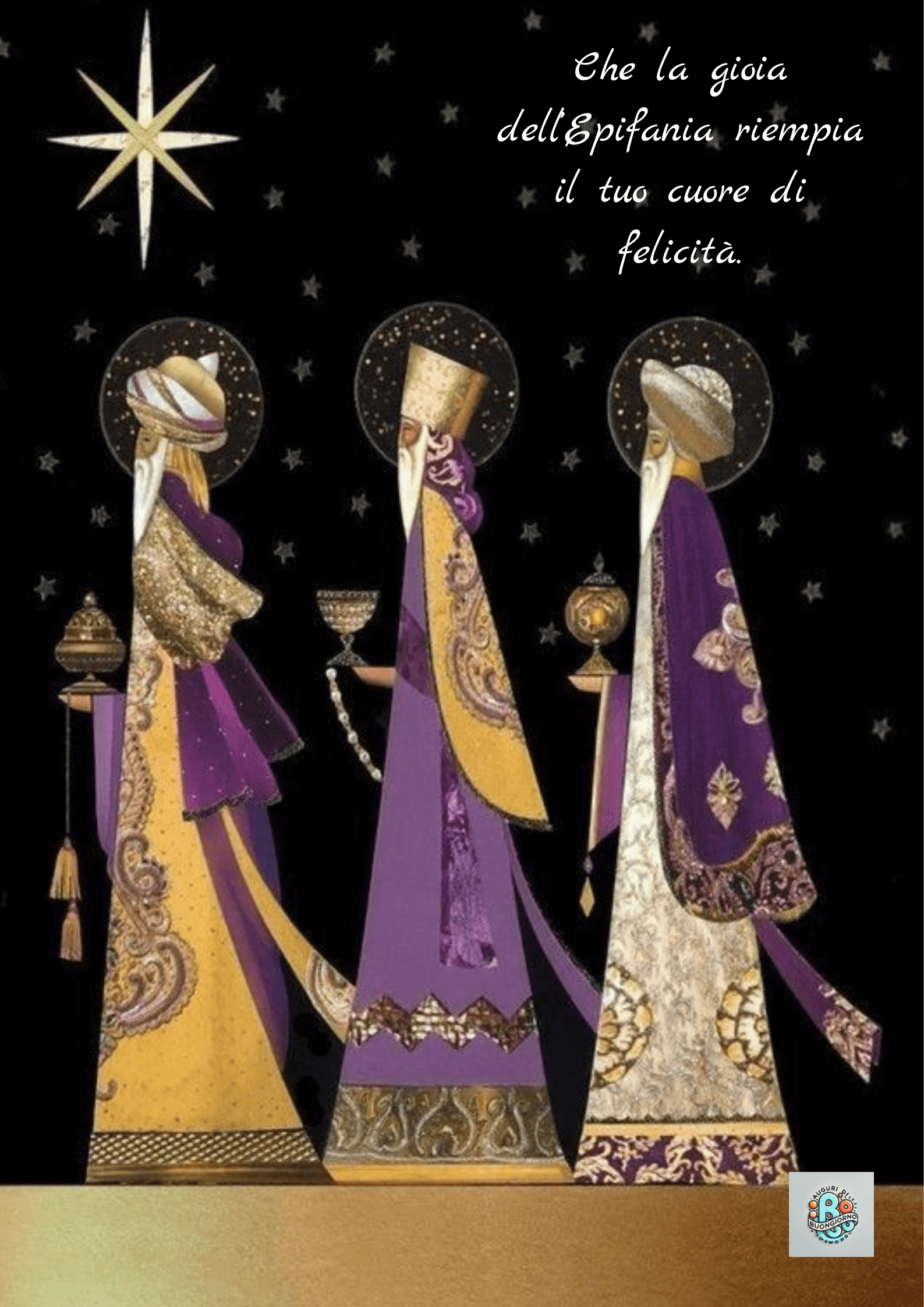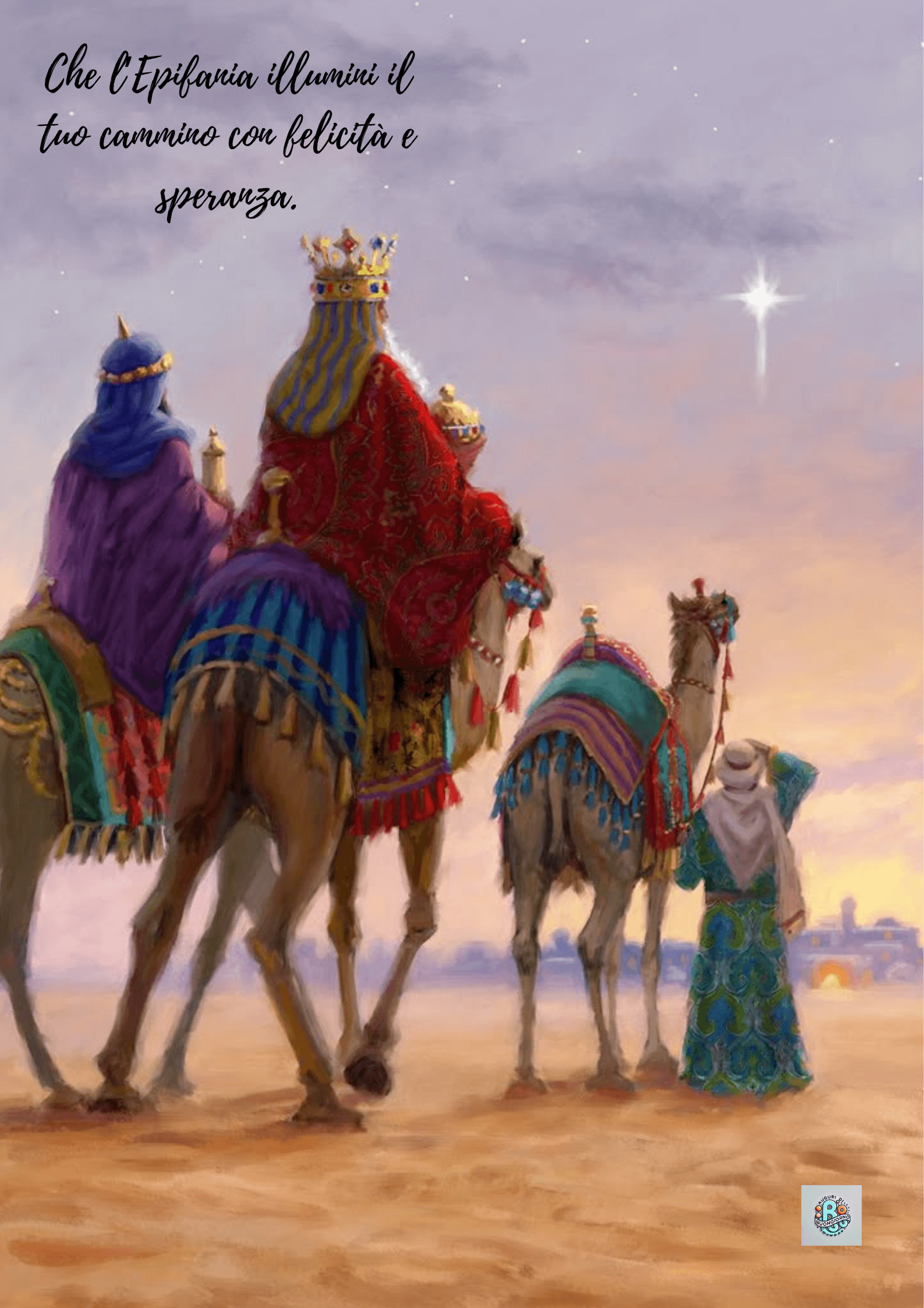 L’immagine dei Re Magi in cammino sotto la stella cometa, portando benedizioni e speranza. Un messaggio di auguri che celebra la luce e la guida divina, portando pace e benedizioni a chiunque lo riceva.