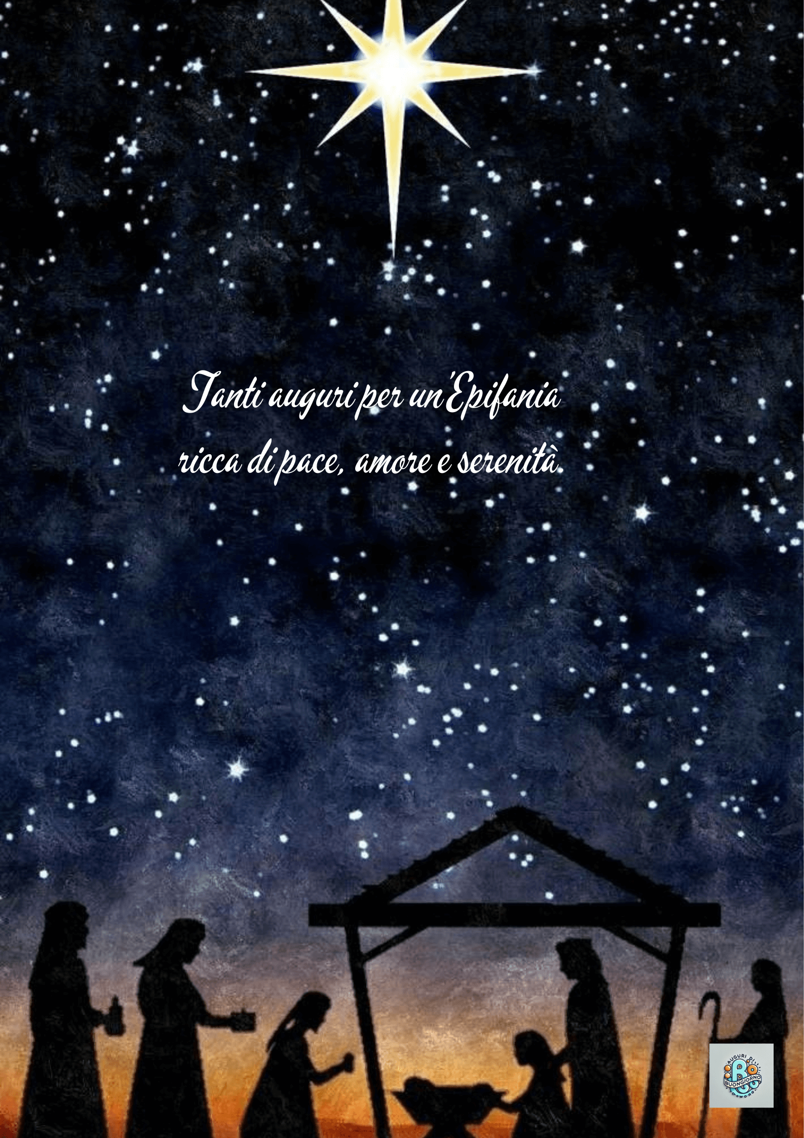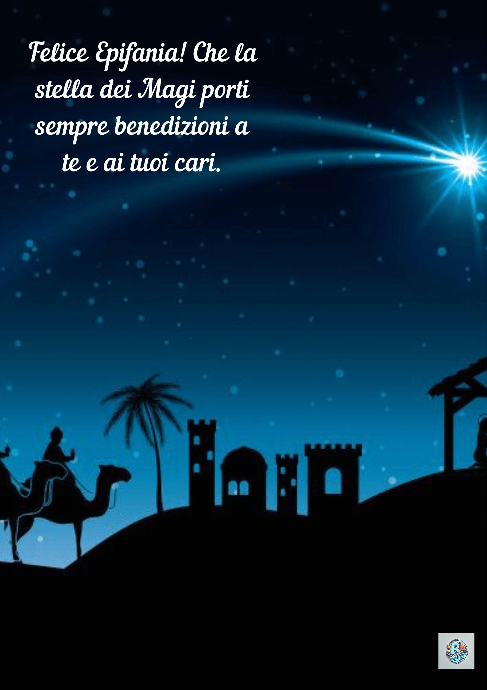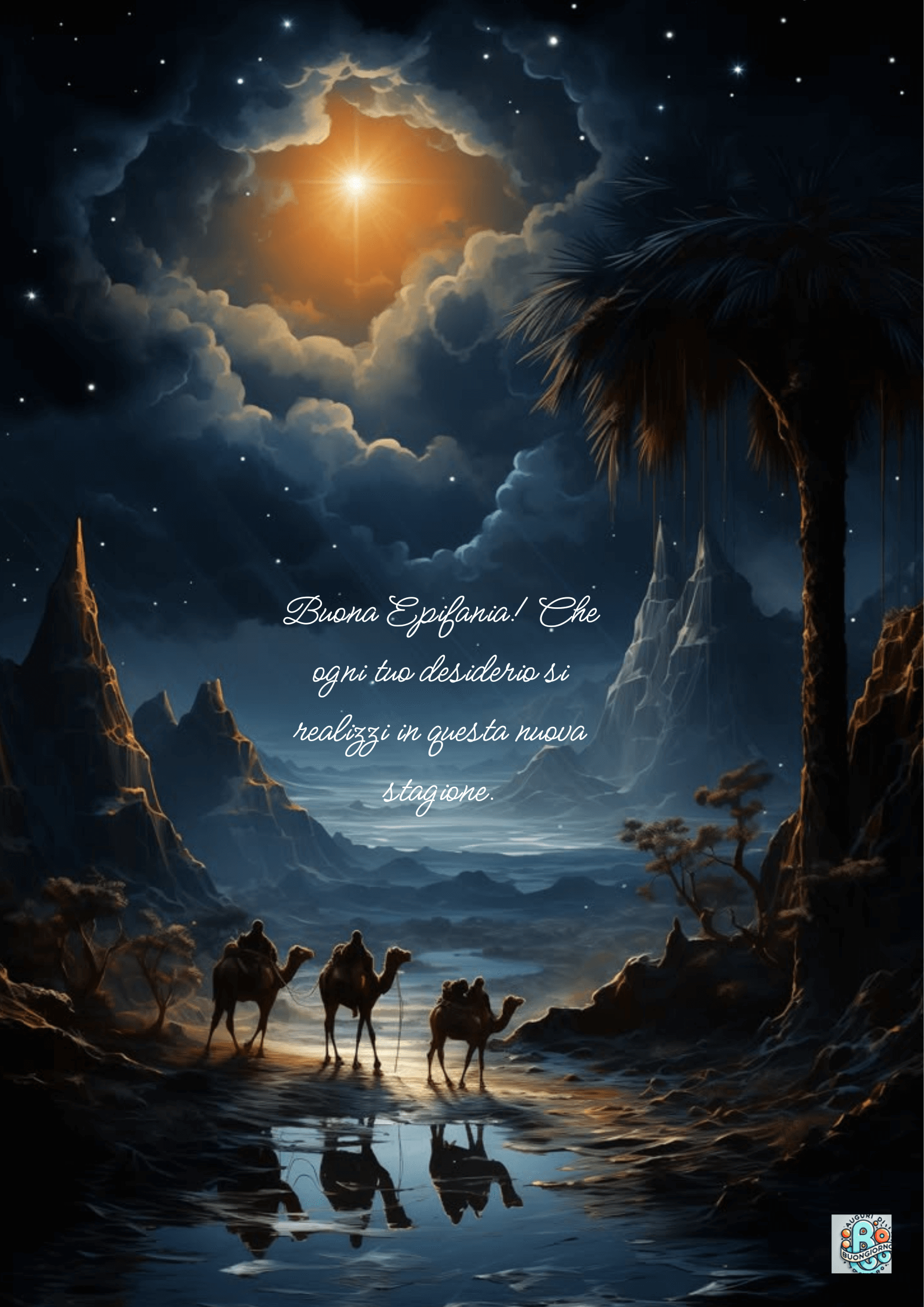 Un’immagine che cattura i Re Magi in viaggio verso la stella cometa, simbolo di speranza e di illuminazione divina. Un messaggio di augurio che invita a seguire la luce della fede e della felicità, celebrando l’Epifania con serenità.