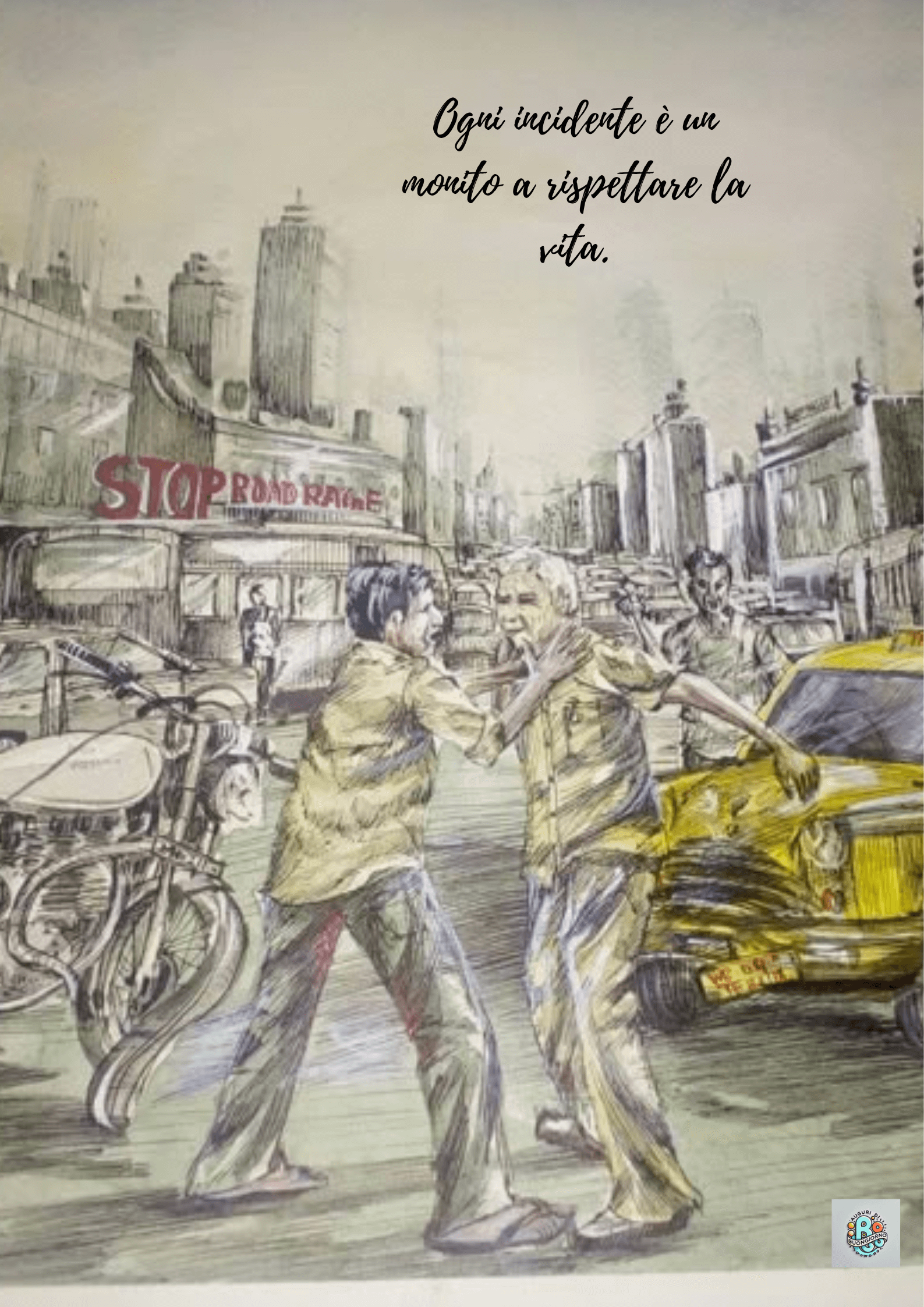 Un’illustrazione potente che mostra l’intensità della violenza stradale, dove un alterco tra due individui innesca una reazione che potrebbe facilmente sfociare in un incidente. Il cartello “STOP ROAD RAGE” in primo piano ci invita a riflettere su come l’ira alla guida possa condurre a situazioni pericolose. Ogni incidente, come questo, ci ricorda la necessità di rispettare la vita e di mantenere la calma.