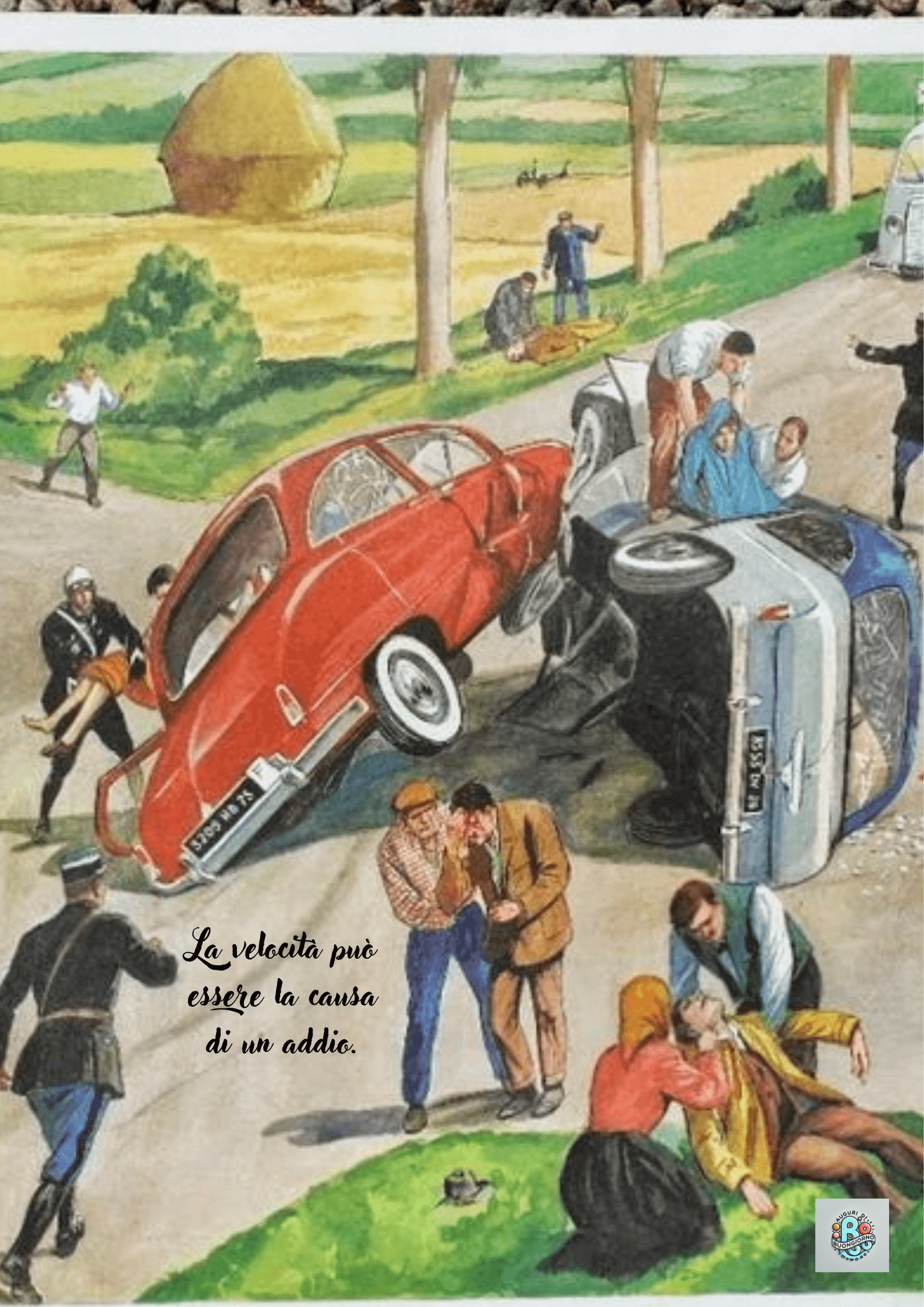 Un’illustrazione d’epoca che mostra le tragiche conseguenze di un incidente causato dalla velocità. Le scene di soccorso e i volti sconvolti rivelano come l’incuria sulla strada possa portare a perdite irreparabili. Il messaggio è chiaro: la velocità può essere la causa di un addio, e la sicurezza deve sempre prevalere.