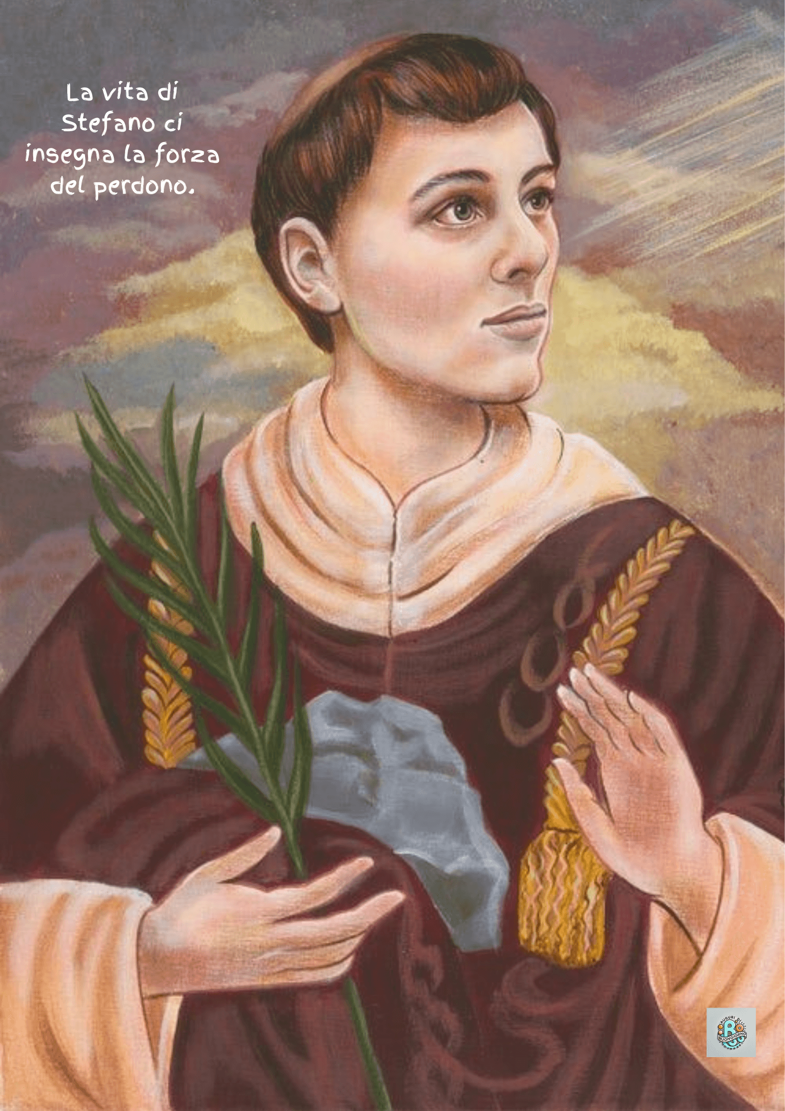 Un ritratto di Santo Stefano che tiene un ramo d’olivo, simbolo di pace e perdono, con uno sguardo sereno che rappresenta la forza del perdono nella sua vita e nel suo martirio.