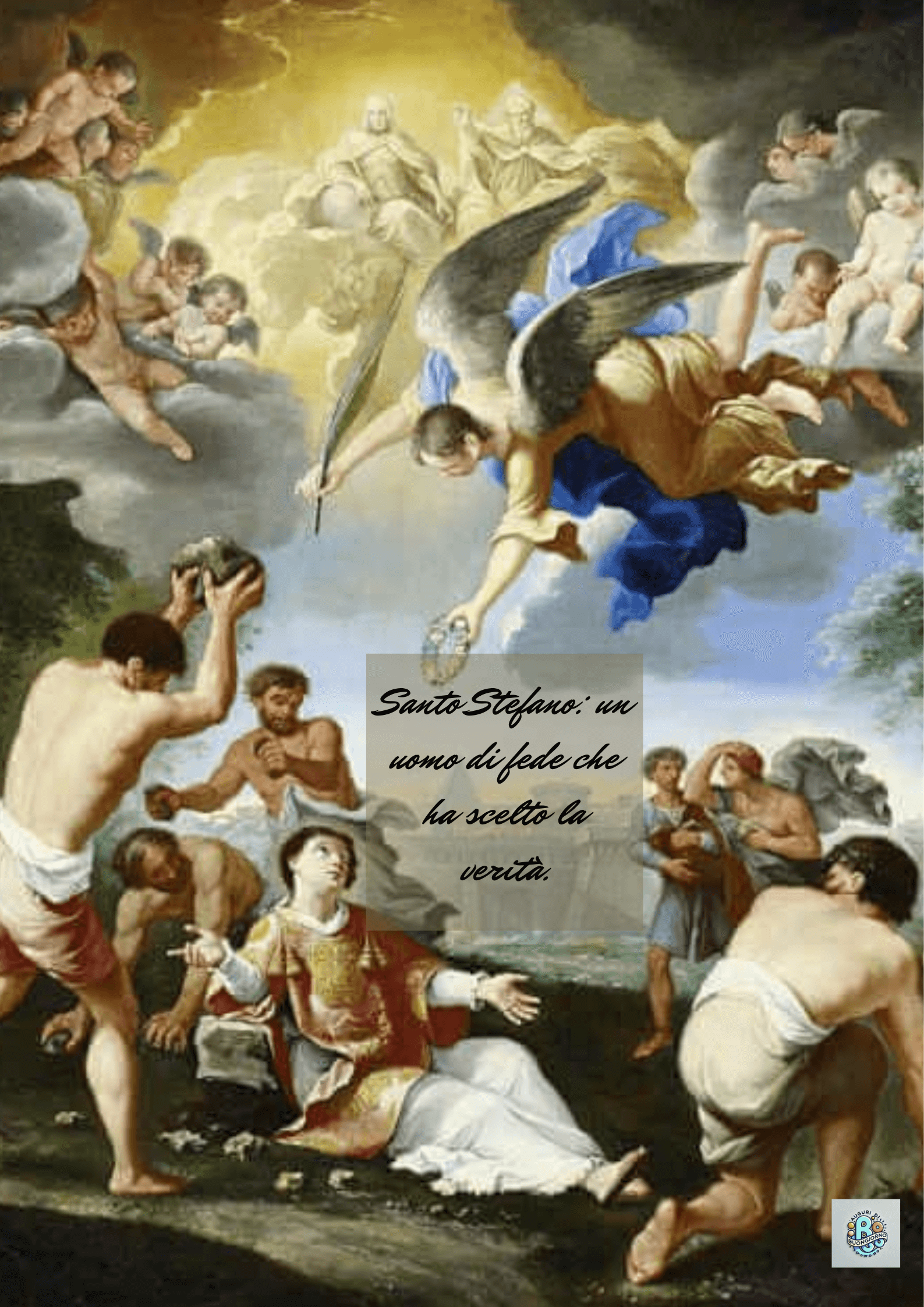 Un dipinto che rappresenta il martirio di Santo Stefano, un uomo di fede che ha scelto la verità, circondato da angeli e testimoni della sua determinazione nel seguire la fede fino alla fine.