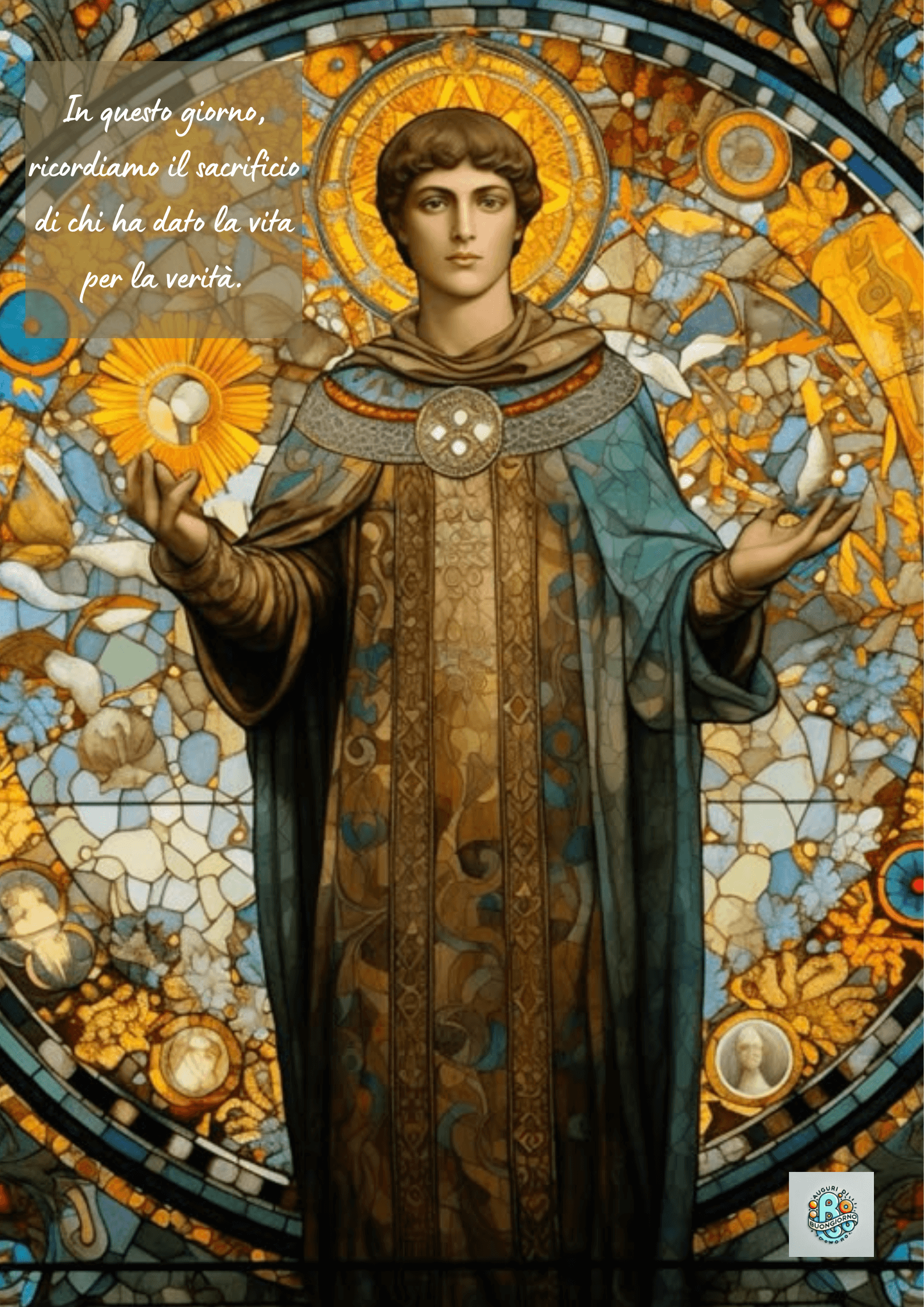 Un’immagine rappresentata in un vetro colorato, con una posa solenne che simboleggia il sacrificio di chi ha dato la vita per la verità, in un giorno che celebra il martirio.